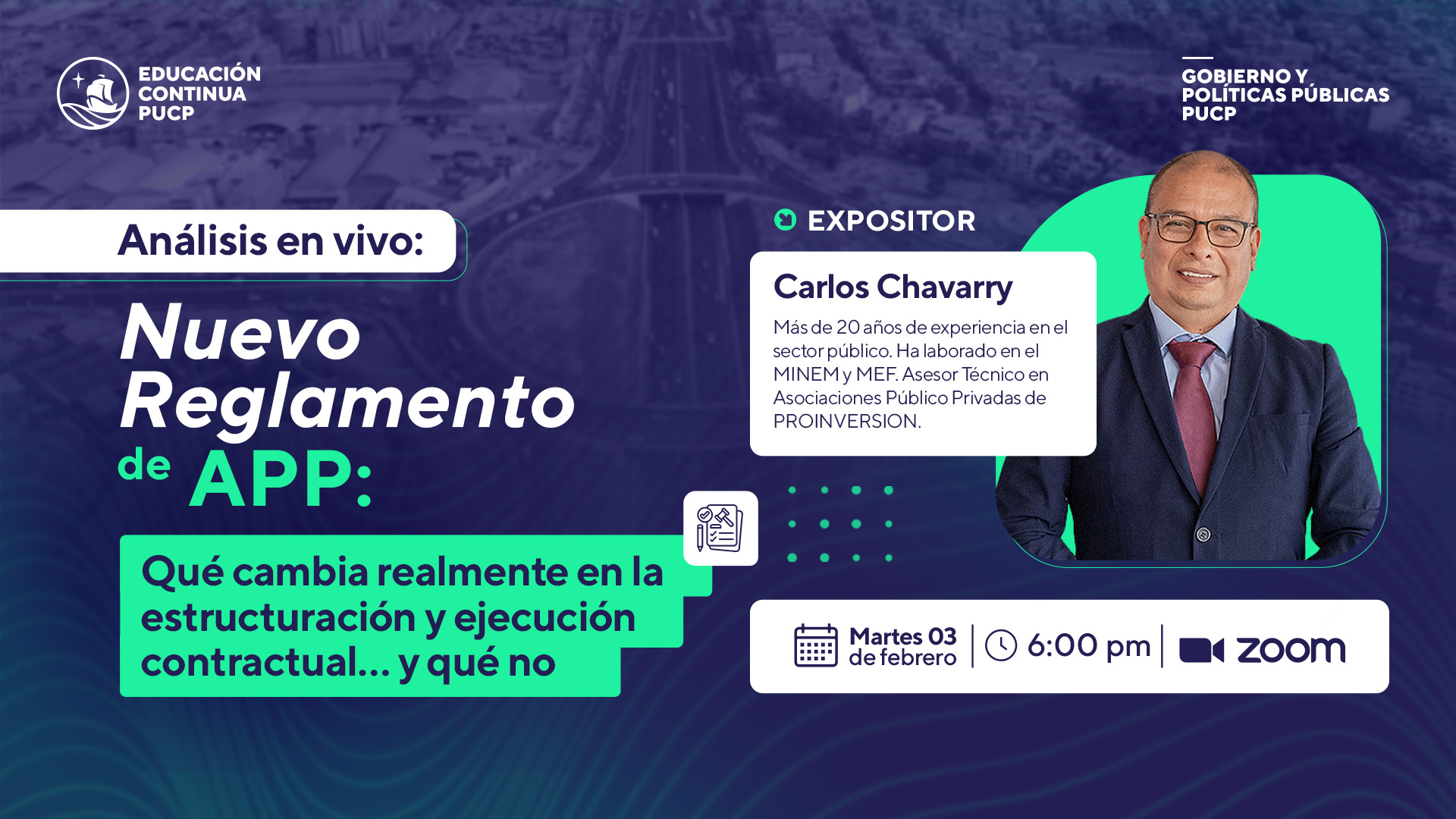 La exposición estará a cargo de Carlos Chavarry, especialista en Asociaciones Público Privadas e infraestructura, con experiencia en estructuración de proyectos y ejecución contractual.