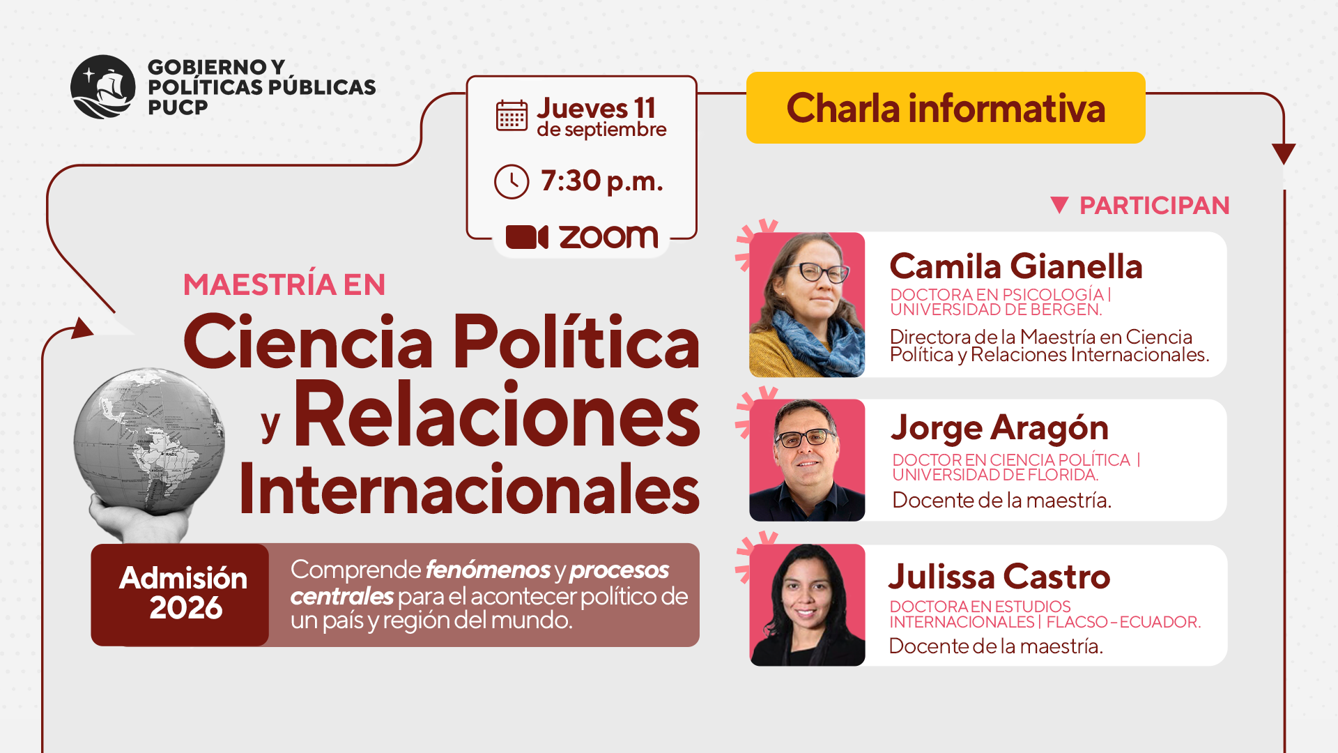 Únete a nuestra próxima Charla Informativa del lanzamiento de la Maestría en Ciencia Política y Relaciones Internacionales 2026-1. Conoce cómo este programa te prepara para afrontar los desafíos actuales con un enfoque académico sólido y práctico. Durante la sesión, exploraremos la estructura del plan de estudios, las opciones de financiamiento y el impacto de nuestros egresados en sus campos. Además, podrás resolver tus dudas en tiempo real.