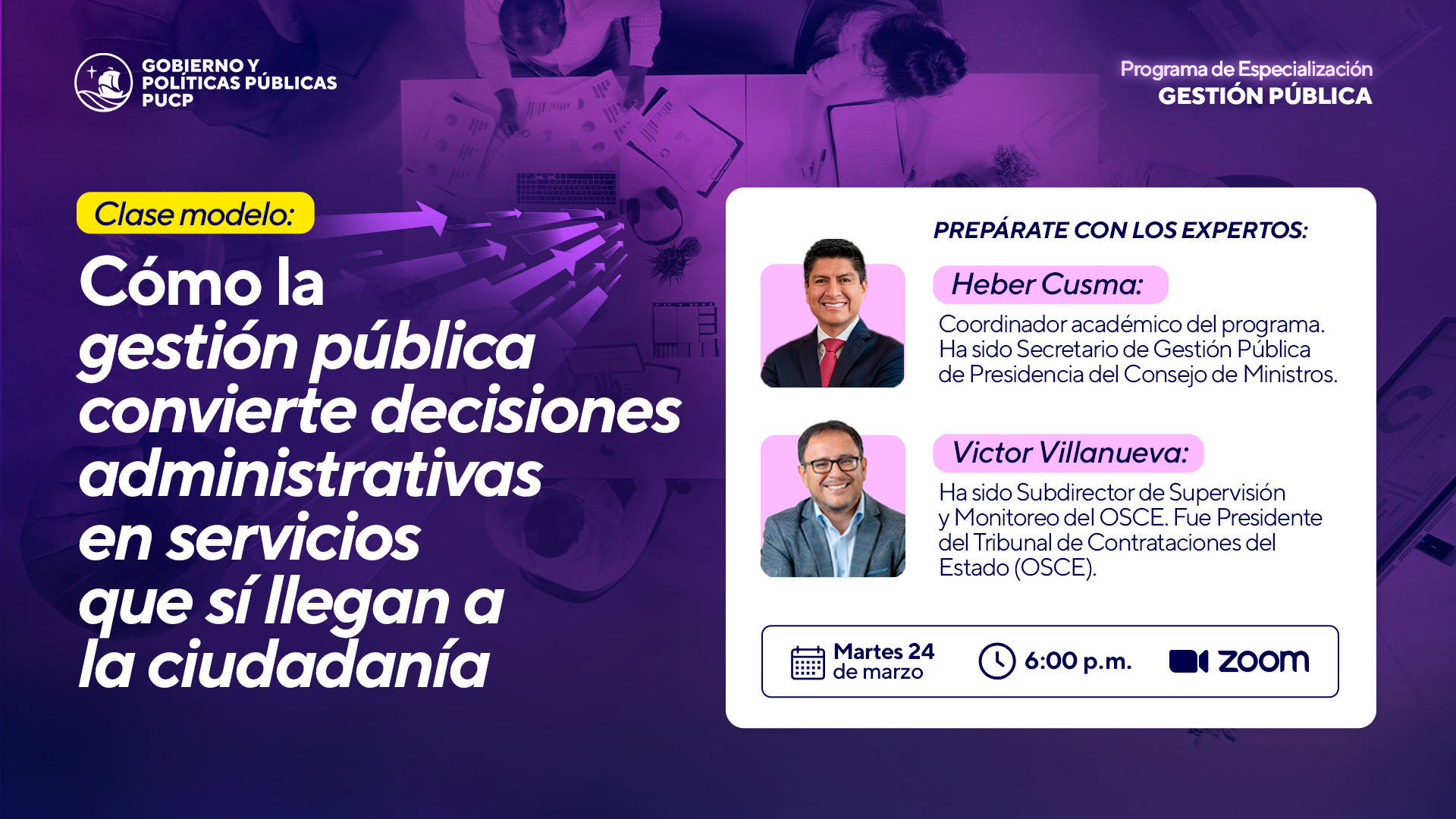 Contaremos con la participación de Heber Cusma, coordinador académico del programa y ex Secretario de Gestión Pública de la PCM, y Víctor Villanueva, ex Subdirector de Supervisión y Monitoreo del OSCE y ex Presidente del Tribunal de Contrataciones del Estado, quienes compartirán su experiencia y reflexiones sobre los retos, decisiones y capacidades que exige hoy la gestión pública.