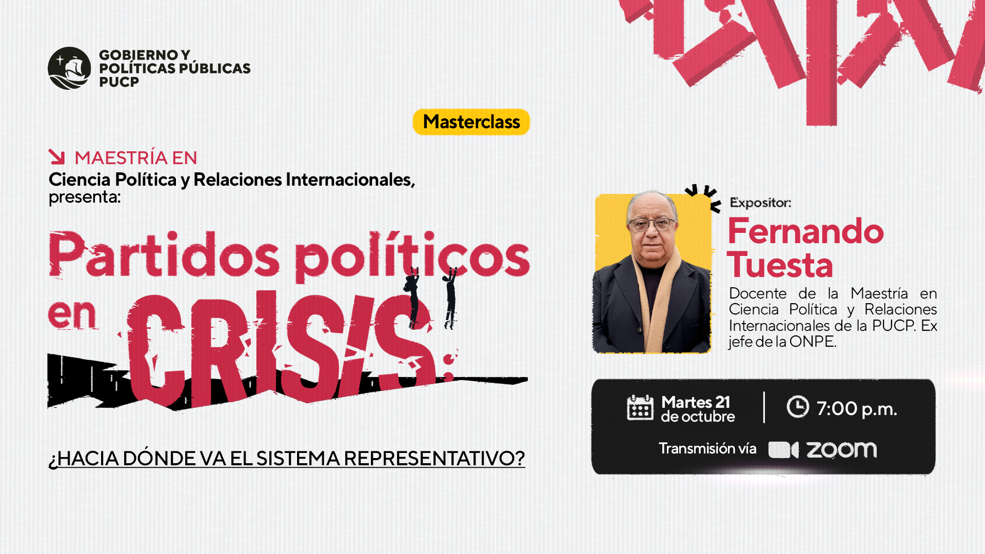 La Escuela de Gobierno y Políticas Públicas PUCP te invita a participar en la Masterclass: “Partidos políticos en crisis: ¿hacia dónde va el sistema representativo?”, un espacio de análisis y reflexión sobre el futuro de la representación política en el Perú y América Latina, a la luz de los desafíos actuales de los partidos políticos y la democracia.