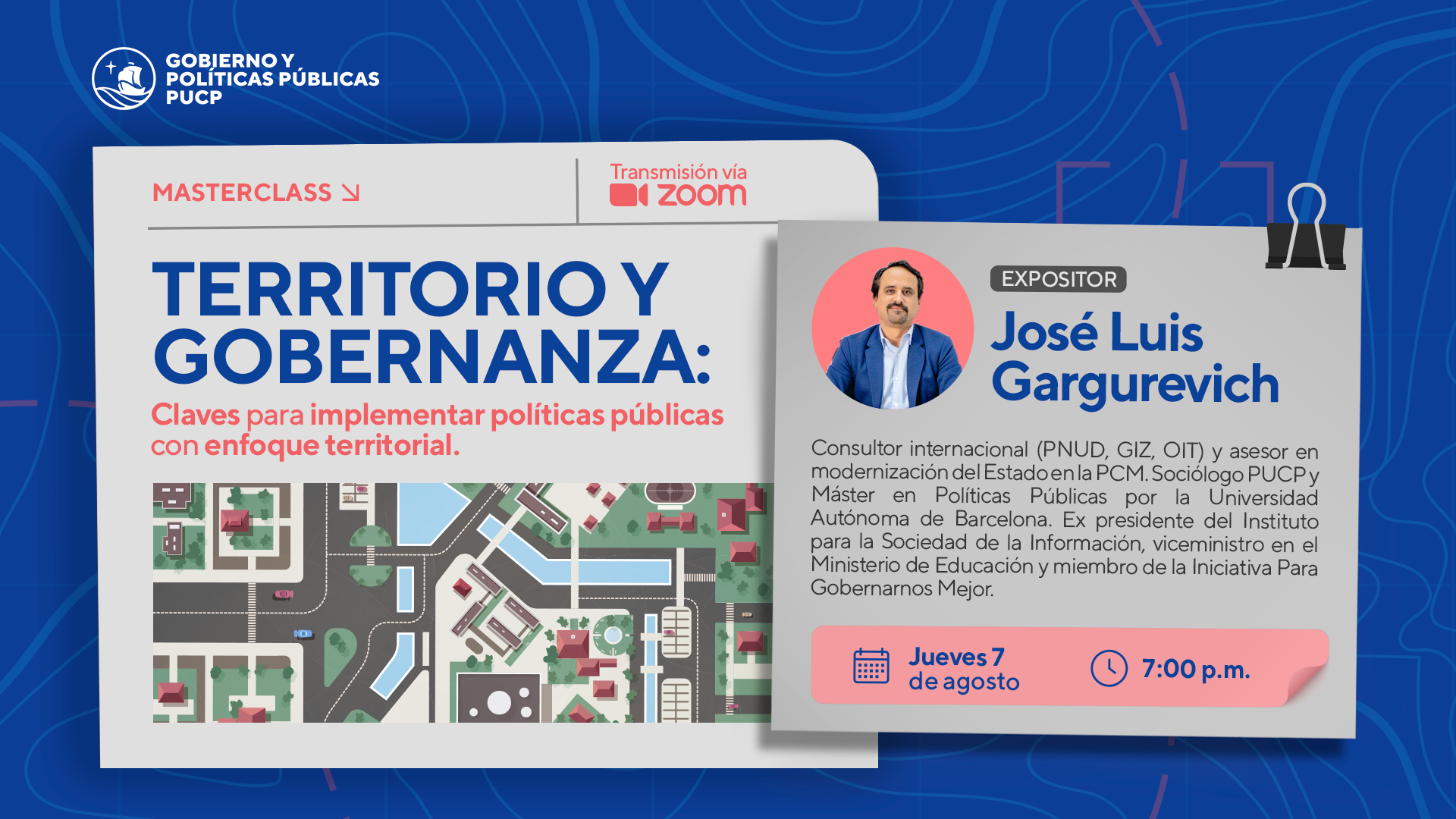 Te invitamos a participar de la Masterclass «Territorio y Gobernanza: Claves para implementar políticas públicas con enfoque territorial» a cargo de José Luis Gargurevich, consultor internacional (PNUD, GIZ, OIT) y asesor en modernización del Estado en la PCM, y conoce más sobre la formulación y gestión de las políticas públicas enfocadas en territorios específicos.