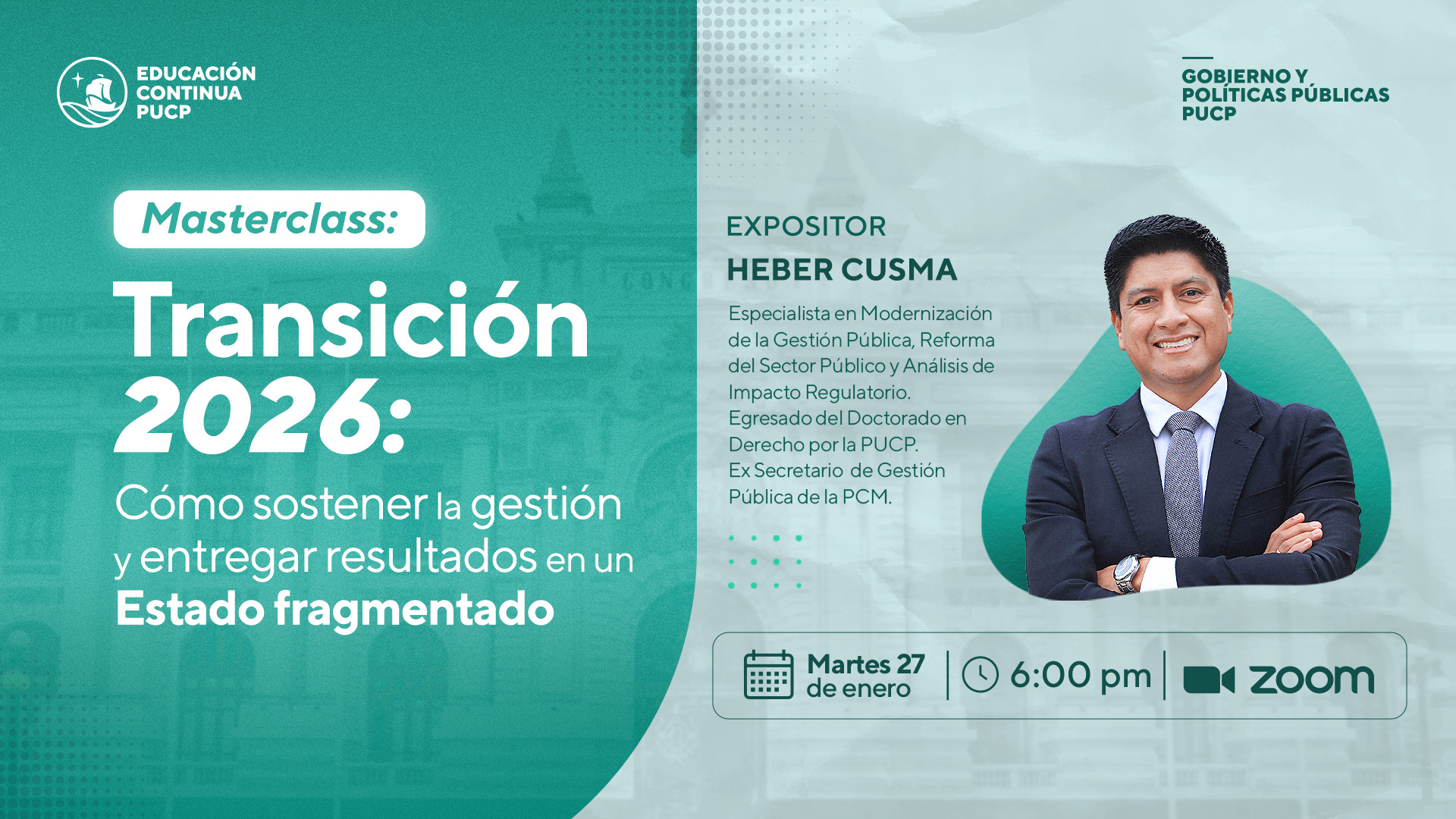 La Escuela de Gobierno y Políticas Públicas PUCP te invita a participar en la Masterclass: “Transición 2026: cómo sostener la gestión y entregar resultados en un Estado fragmentado”, una sesión en vivo orientada a brindar herramientas para mantener continuidad, coordinar actores y asegurar resultados en contextos de alta complejidad institucional.