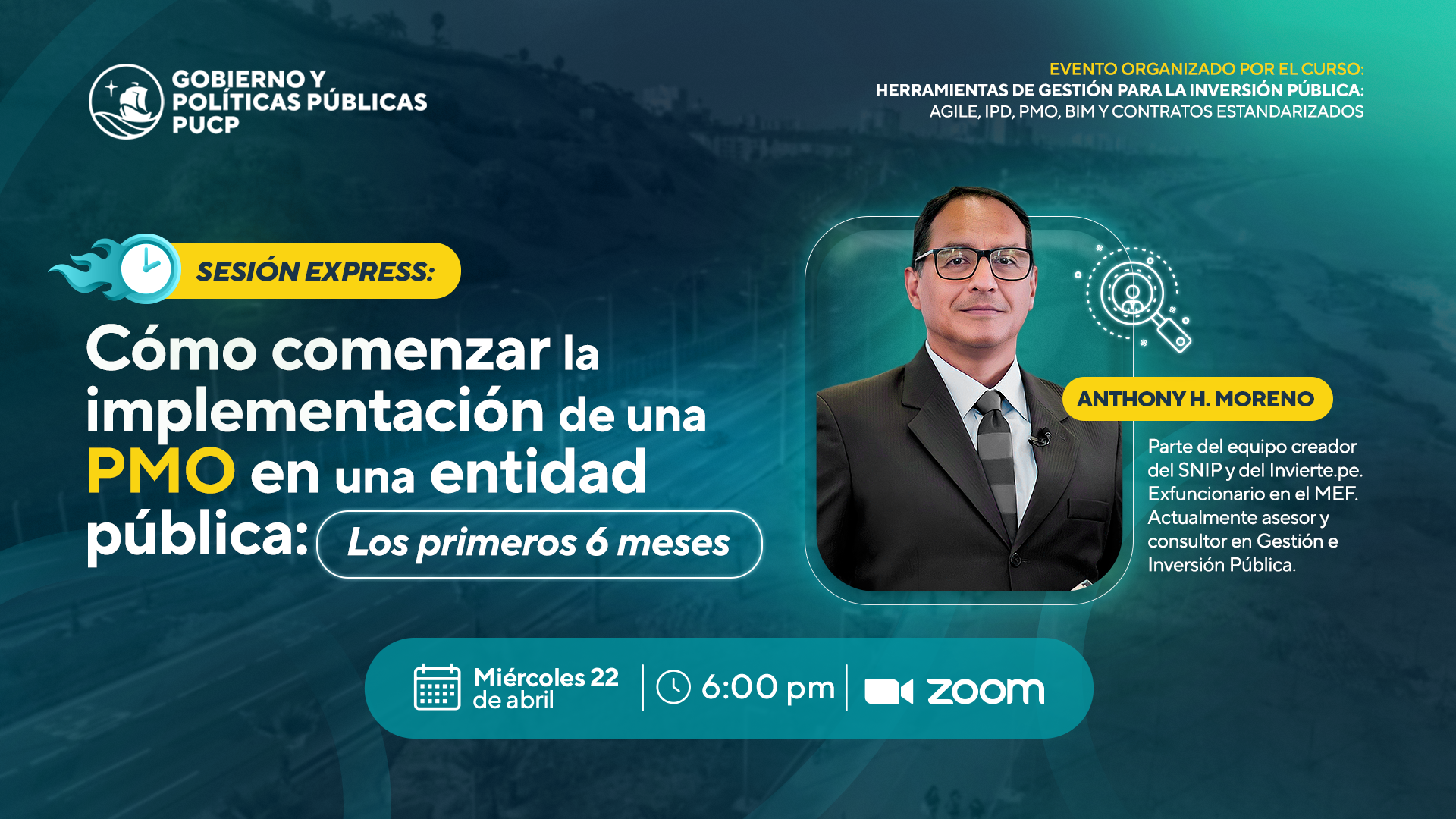 La sesión estará a cargo de Anthony H. Moreno, ingeniero por la PUCP, co-creador del SNIP y del Invierte.pe, y especialista con amplia experiencia en inversión pública, PMO y gestión de proyectos en entidades públicas.