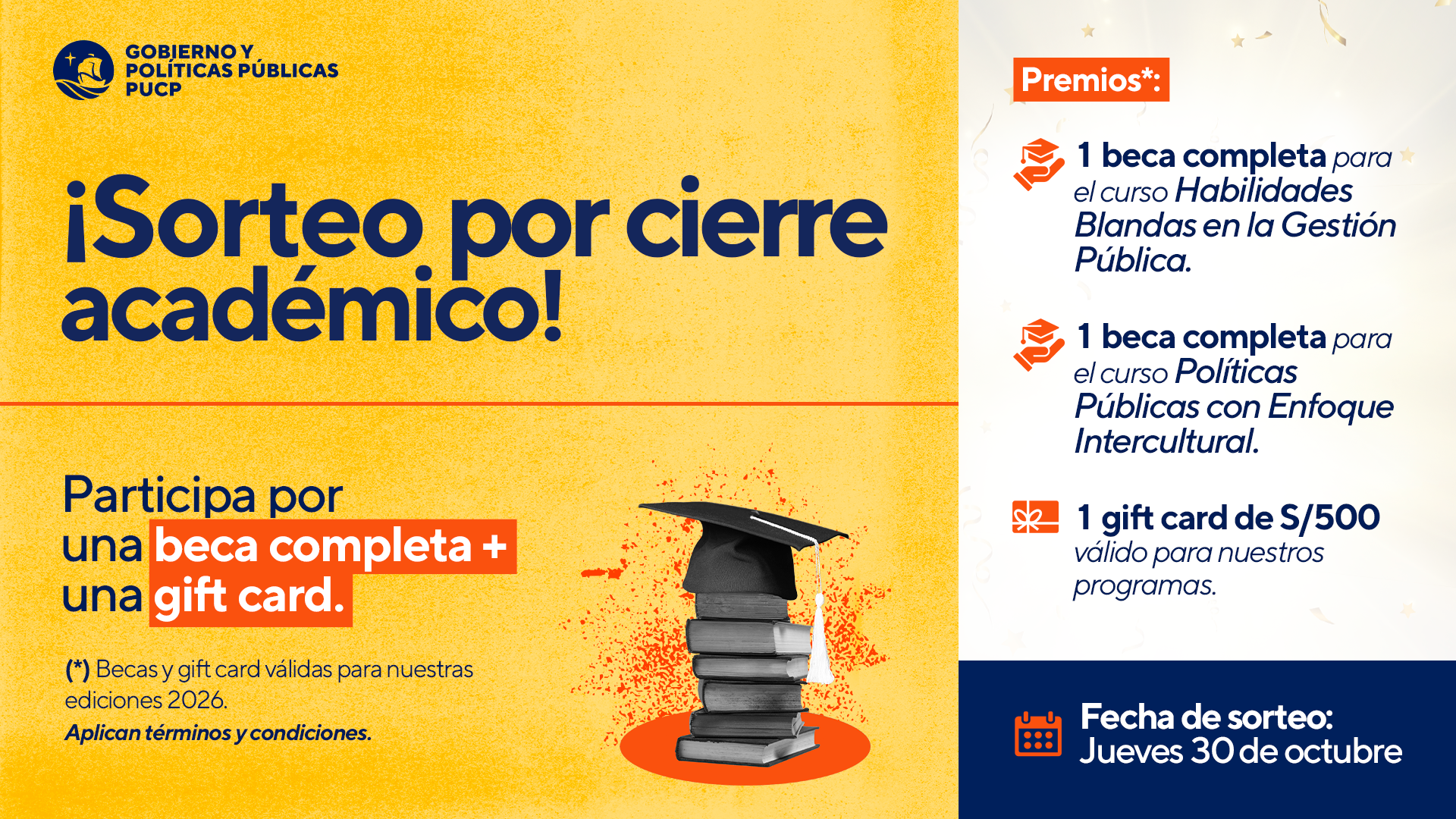 Con motivo del cierre del ciclo académico, la Escuela de Gobierno y Políticas Públicas de la PUCP ha organizado un sorteo especial dirigido a todos los alumnos matriculados en los cursos de capacitación Gestión Pública y Gobernanza y Planeamiento Estratégico en el Sector Público (edición noviembre). Esta es una excelente oportunidad para reconocer el compromiso de nuestros alumnos y seguir acompañando su desarrollo profesional.