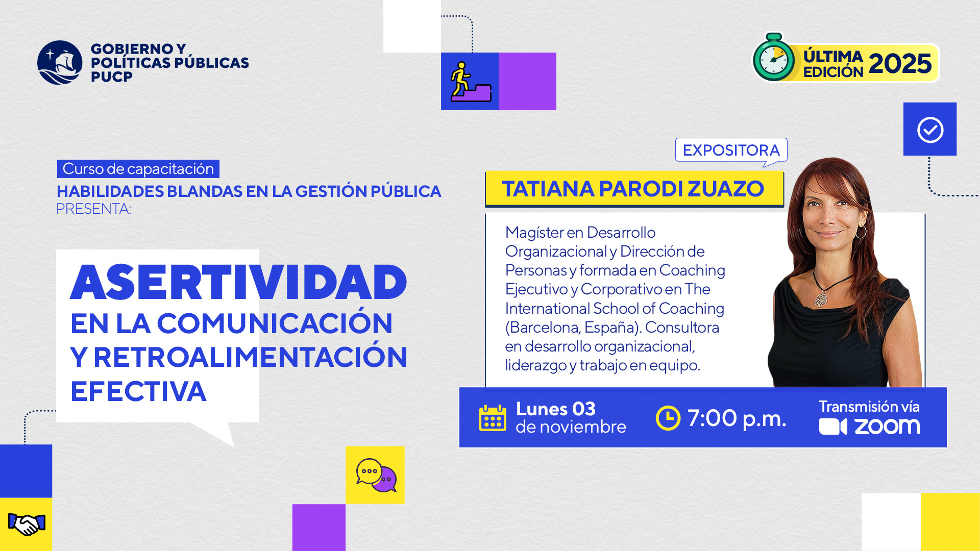 La Escuela de Gobierno y Políticas Públicas PUCP te invita a participar en el Taller: “Habilidades Blandas: Asertividad en la comunicación y retroalimentación efectiva”, un espacio dinámico diseñado para fortalecer competencias de liderazgo, comunicación y colaboración en el sector público.