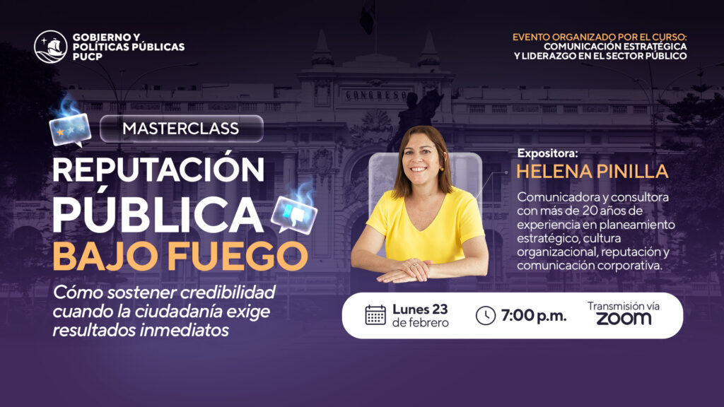 Evento Masterclass: "Reputación pública bajo fuego: cómo sostener credibilidad cuando la ciudadanía exige resultados inmediatos" 23/02/2026 07:00 pm Vía Zoom