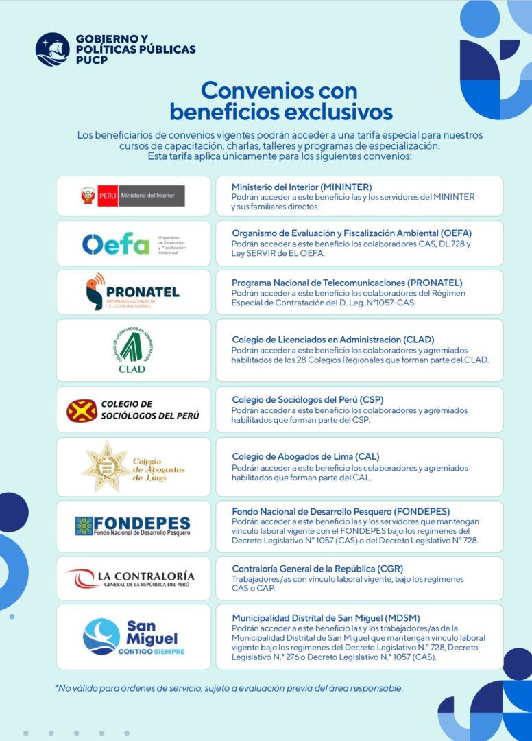 En esta página podrás visualizar los convenios interinstitucionales* vigentes que mantiene la Escuela de Gobierno y Políticas Públicas PUCP, el cual aplican a los Cursos de Capacitación y Programas de Especialización que ofrecemos.